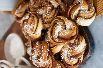 - Paista pullia uunissa 210 asteessa kiertoilmauunissa (225 astetta normaali uuni) noin 8–10 minuuttia. Voitele uunituoreet pullat heti siirapilla.