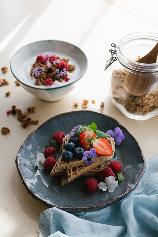 Laita kaikki ainekset blenderiin ja surauta tasaiseksi seokseksi. Paista vohveliraudalla rapeaksi. Tarjoile tuoreiden marjojen ja vaniljakastikkeen kanssa.